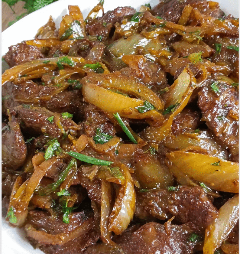 A classic dish featuring tender beef liver slices cooked with caramelized onions, seasoned with herbs and spices for a flavorful and nutritious meal.