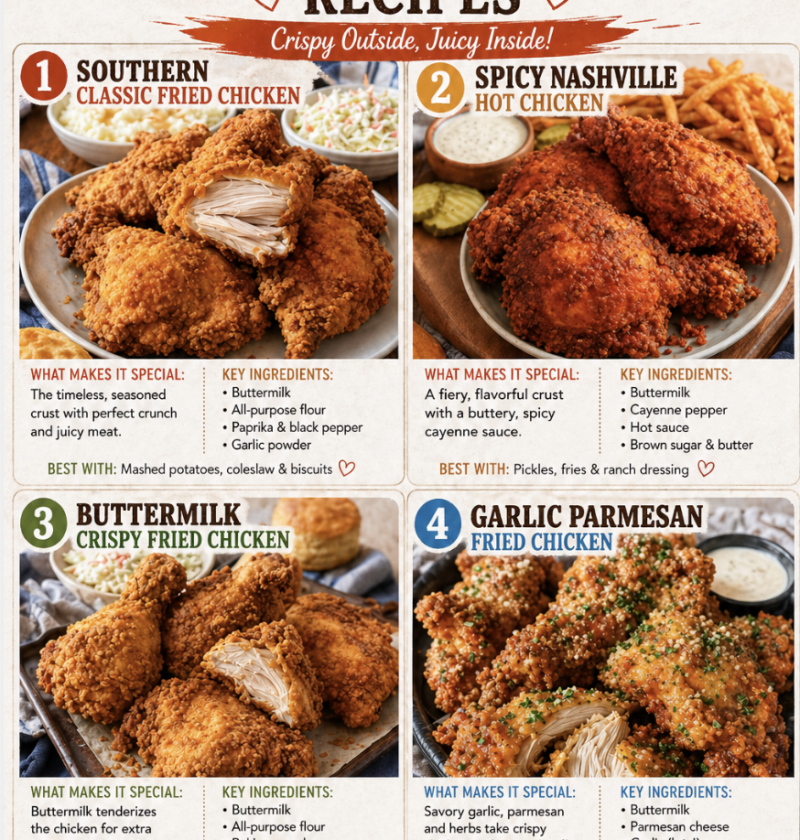 Fried chicken is one of the most loved comfort foods in the world. It is crispy on the outside, juicy on the inside, and full of rich flavor that makes every bite satisfying. Whether you enjoy classic Southern-style fried chicken, spicy fried chicken, buttermilk fried chicken, or crispy boneless fried chicken strips, there is always a version to love. These 4 tasty fried chicken recipes are perfect for family dinners, weekend meals, parties, or anytime you want a homemade meal that feels special and comforting. Each recipe has its own flavor and texture, giving you different delicious ways to enjoy crispy fried chicken at home.