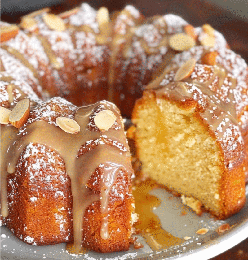 Once the cake is done, cool it in the pan for 10 minutes, then invert it onto a wire rack. Drizzle the glaze over the warm cake and garnish with sliced almonds, if desired.