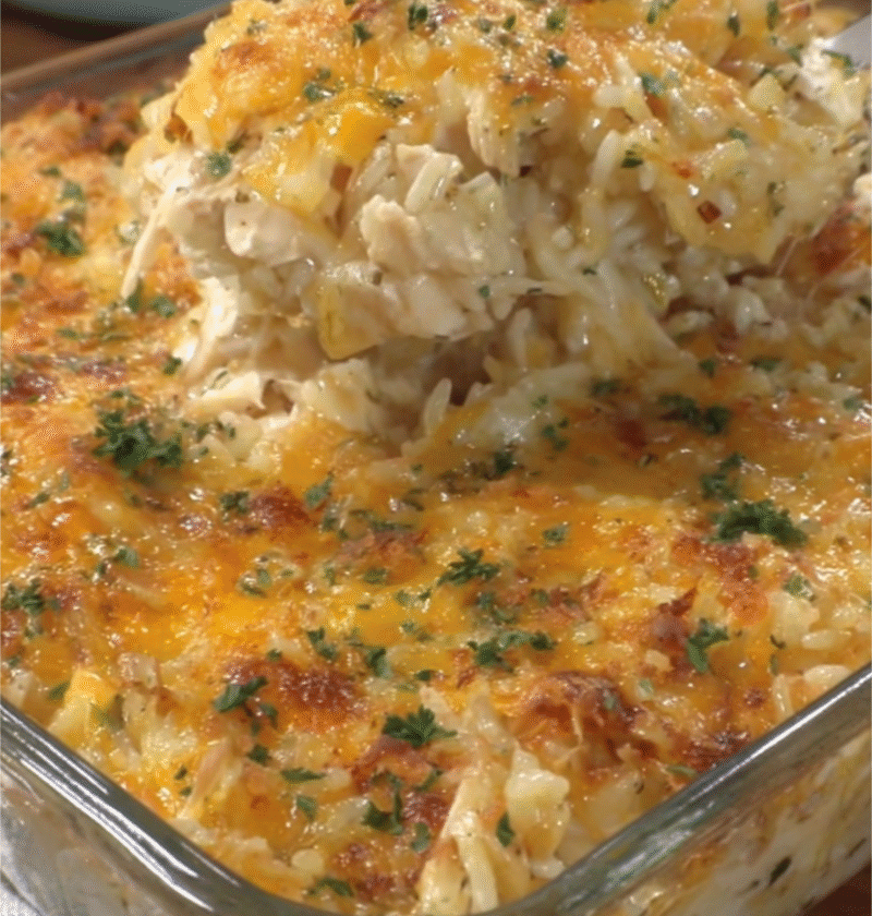 A delicious and comforting casserole dish with creamy textures, tender chicken, and perfectly cooked rice. Perfect for family dinners, potlucks, or any occasion.
