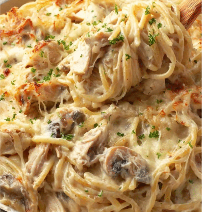7. Serve the creamy chicken tetrazzini pasta hot, garnished with chopped parsley.