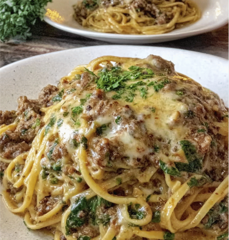 7. Serve the garlic butter linguine with cheesy beef and Italian sausage hot, garnished with fresh herbs or additional cheese if desired.
