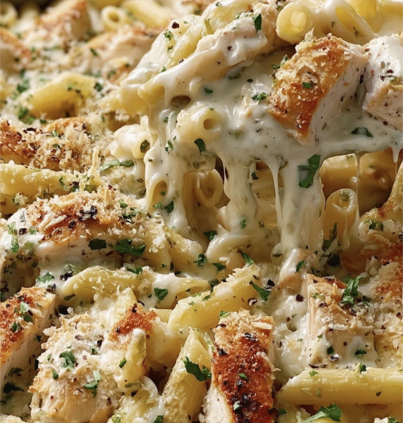 A delectable and comforting dish that combines the rich flavors of garlic, parmesan, tender chicken, and perfectly cooked pasta. This hearty meal is creamy, savory, and gooey, making it a favorite among both kids and adults.
