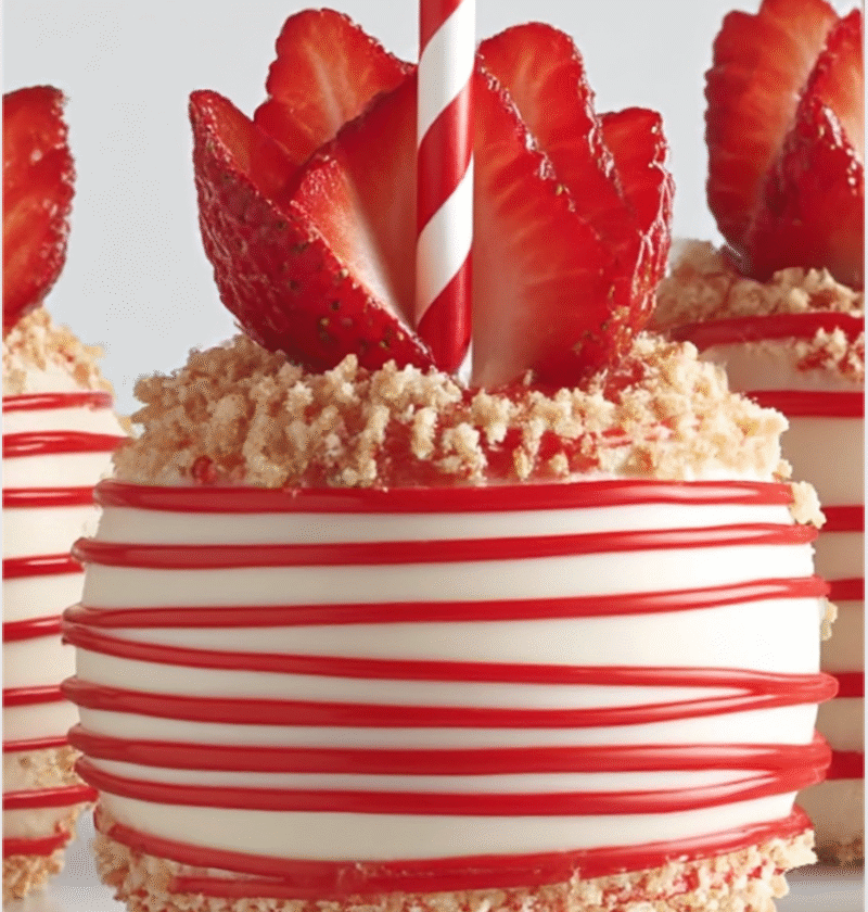 A delightful twist on classic candy apples, these Strawberry Shortcake Candy Apples combine fresh strawberries, candy coating, and shortbread cookies for a unique and delicious treat.